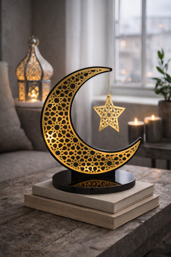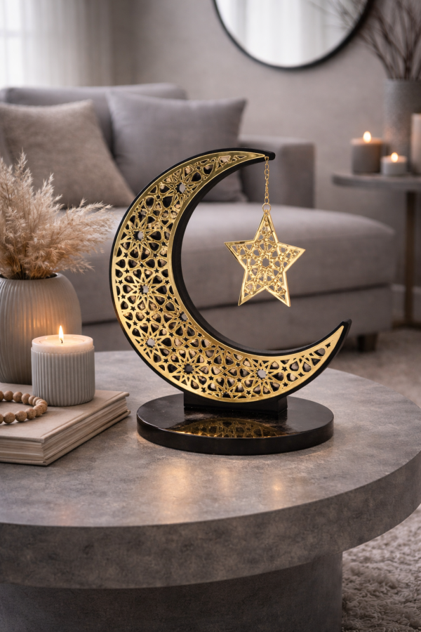 An ornate crescent and star piece featuring traditional Islamic patterns. Perfectly compliments Eid décor or your family’s Iftar table.